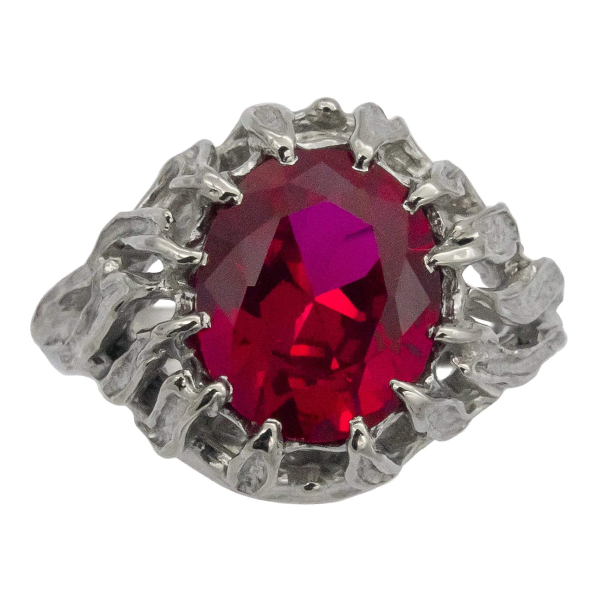 Stone Options: 12 x 10 mm Lab Grown Ruby, 12 x 10 mm Natural Garnet (additional $25.00 USD), or 12 x 10 mm Lab Grown Star Ruby (additional $90.00 USD).