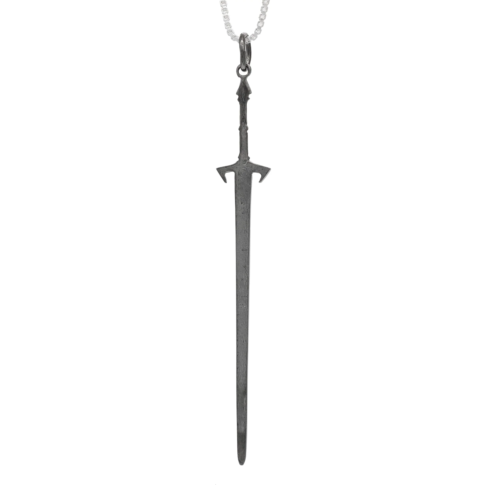 Details: The Nightblood pendant is solid sterling silver and blackened with a ruthenium plating*. The sword measures 74.6 mm long including the bail, 10.6 mm wide at the cross guard, and 2.4 mm at the thickest point. The pendant weighs approximately 2.7 grams and the back of the pendant is textured and stamped with our makers mark, copyright, and metal content - Sterling.