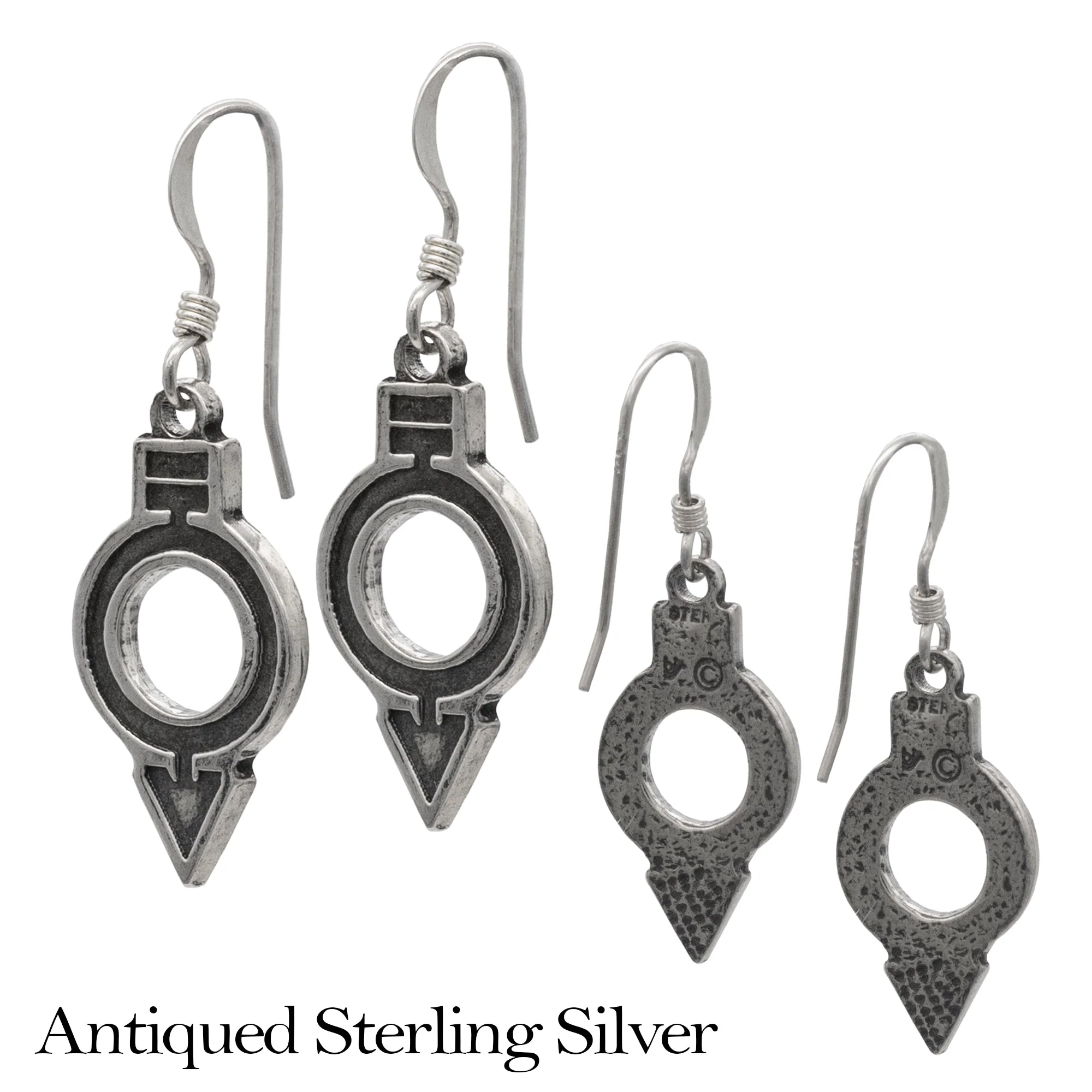 Details: The Red symbol charms are solid sterling silver and measure 22 mm tall, 11.2 mm at the widest point, and 1.5 mm thick. The earrings weigh 3.7 grams (1.8 grams each). The earrings are a dangle style hung on sterling silver ear wires. The back of the Red Society charms are textured and stamped with our makers mark, copyright, and metal content - sterling.