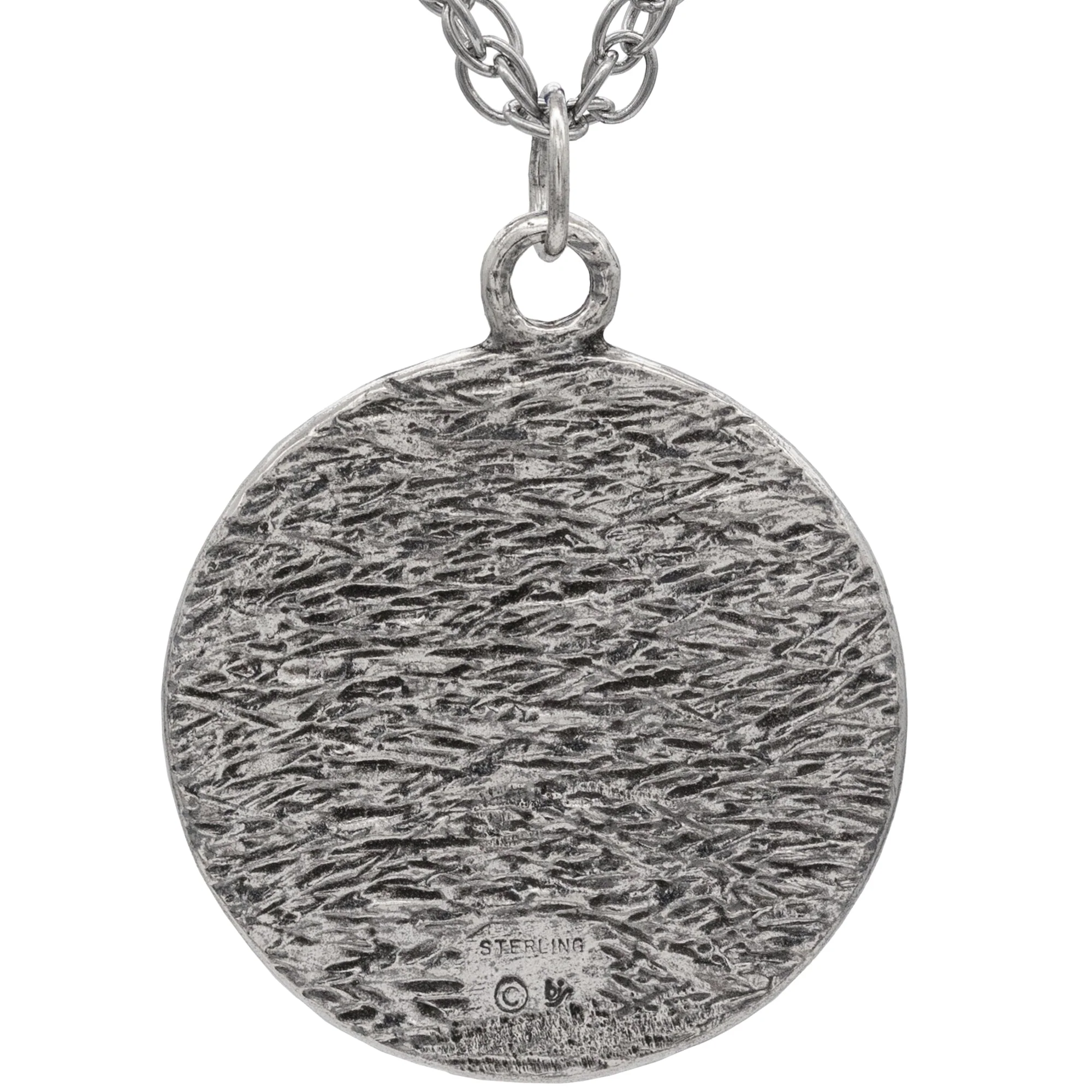 Details: The Steel Alphabet Medallion is made of sterling silver. The Steel Alphabet measures 42.3 mm long, 36.4 mm wide and 2.4 mm thick. The medallion weighs 19.3 grams and the back of the pendant is textured, stamped with our makers mark, copyright symbol, and STER (sterling).